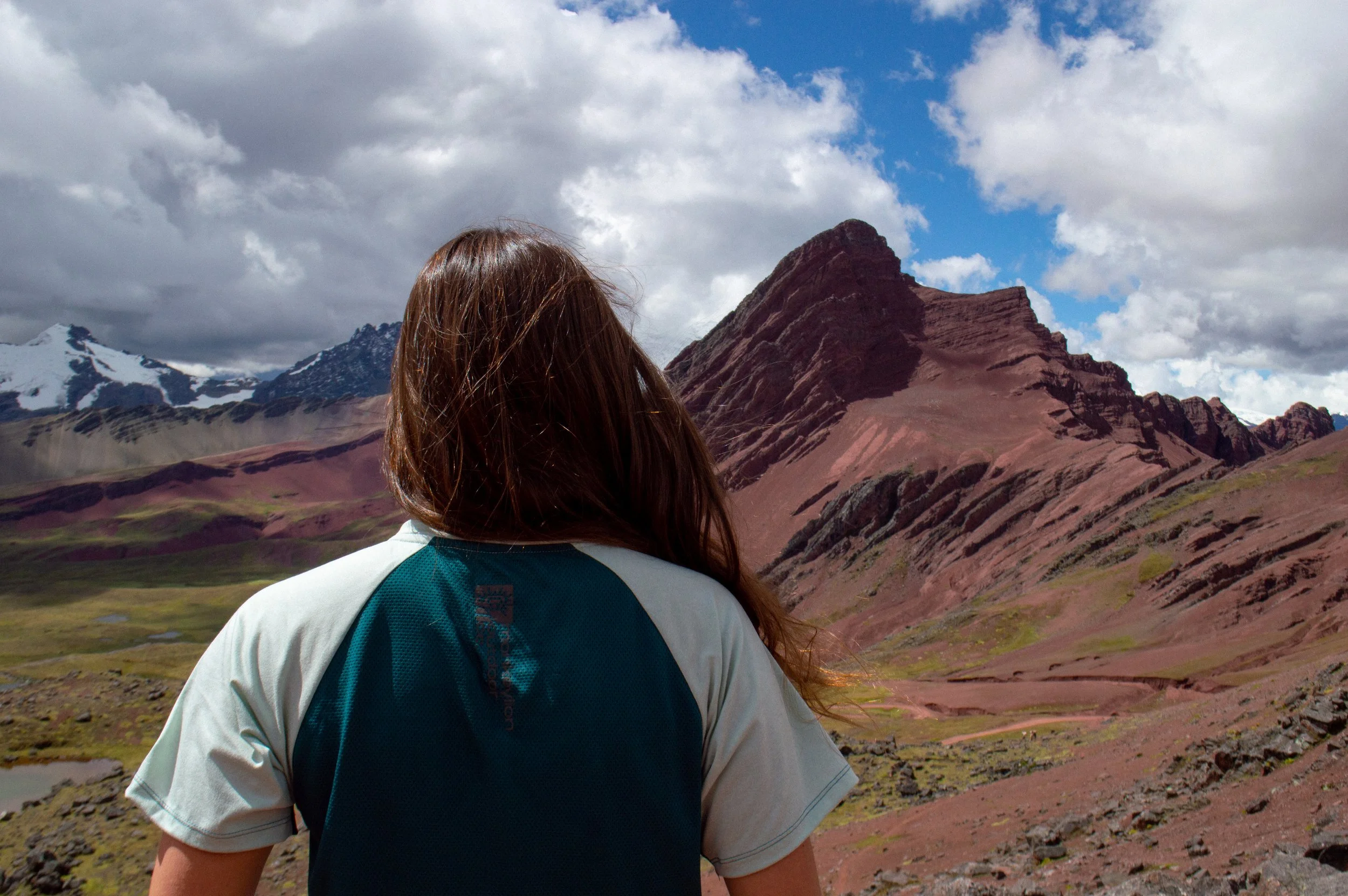 Al día siguiente comenzamos temprano, con un desayuno a las 6 am, para caminar antes de que llegaran los turistas a la famosa montaña de 7 colores (Vinicunca). Casi todo el trayecto fue entre neblina, pero al llegar al valle de Vinicunca, las nubes se disiparon y tuvimos una vista clara del Ausangate. Después de saludar a las alpacas con lentes de sol y contemplar las montañas teñidas de minerales, descendimos hacia el otro lado del valle, donde el equipo local nos esperaba con una casita de campaña y una comida recién hecha.